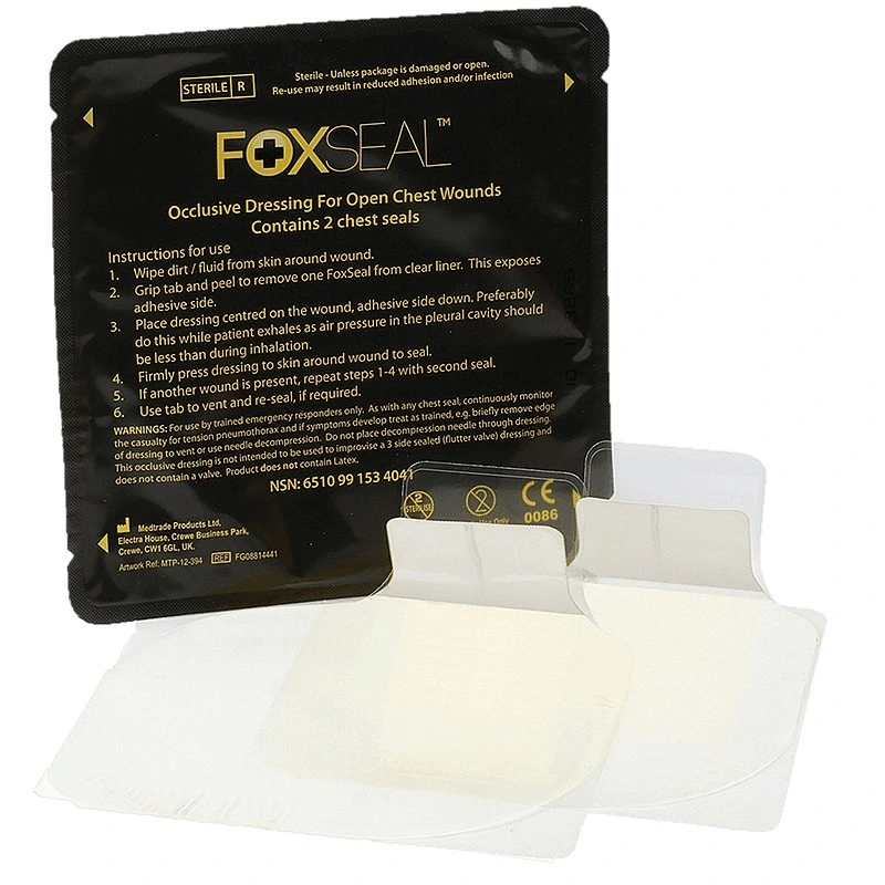 FOX Chest Seal je okluzívne hrudné krytie bez ventilu určené na ošetrenie otvorených poranení hrudníka v život ohrozujúcich situáciách, ktoré by mohli viesť k pneumotoraxu. FOX Chest Seal – hrudný obväz má silnú priľnavosť k pokožke aj v extrémnych podmienkach a teplotách (od -18 °C do 55 °C) a pri prítomnosti telesných tekutín na pokožke.