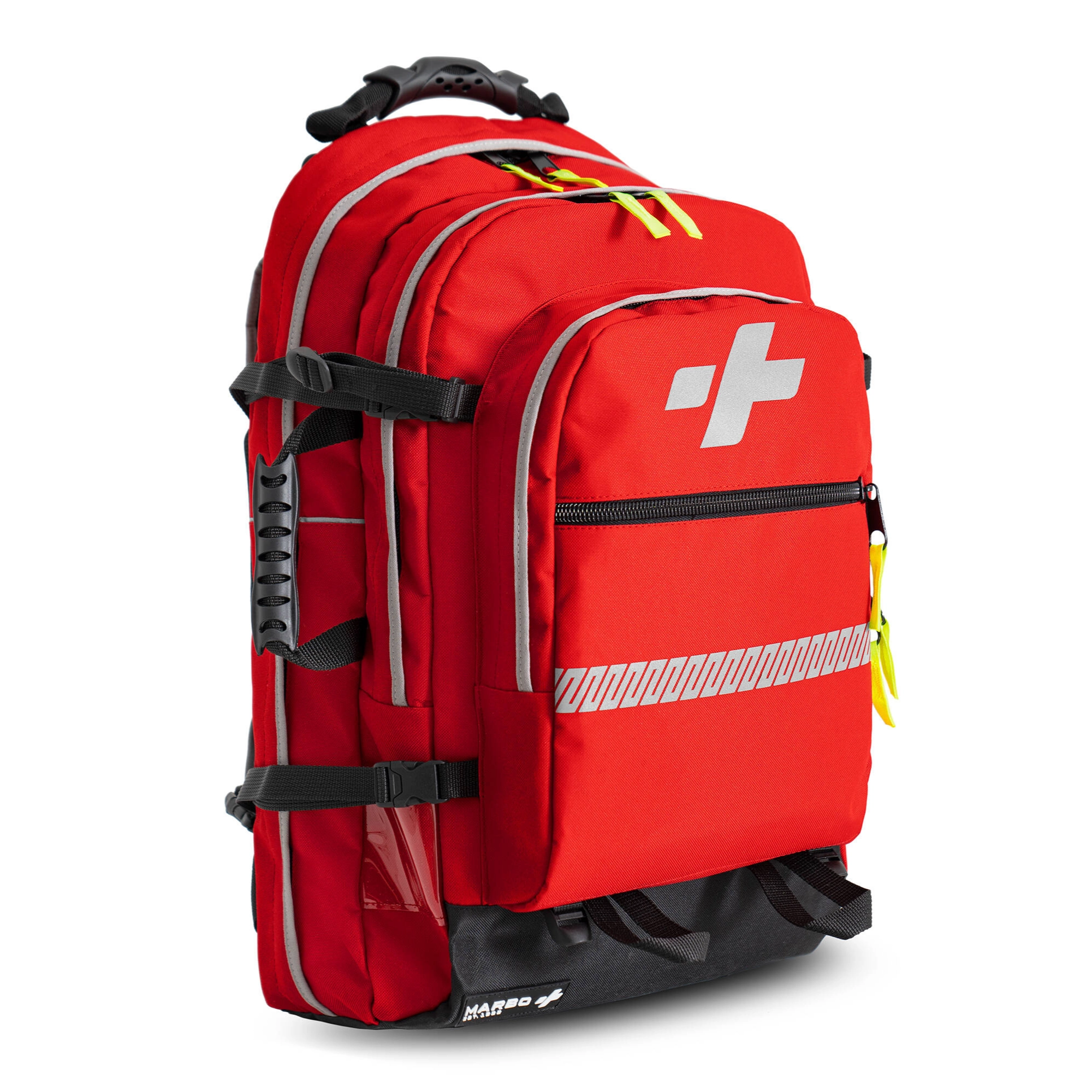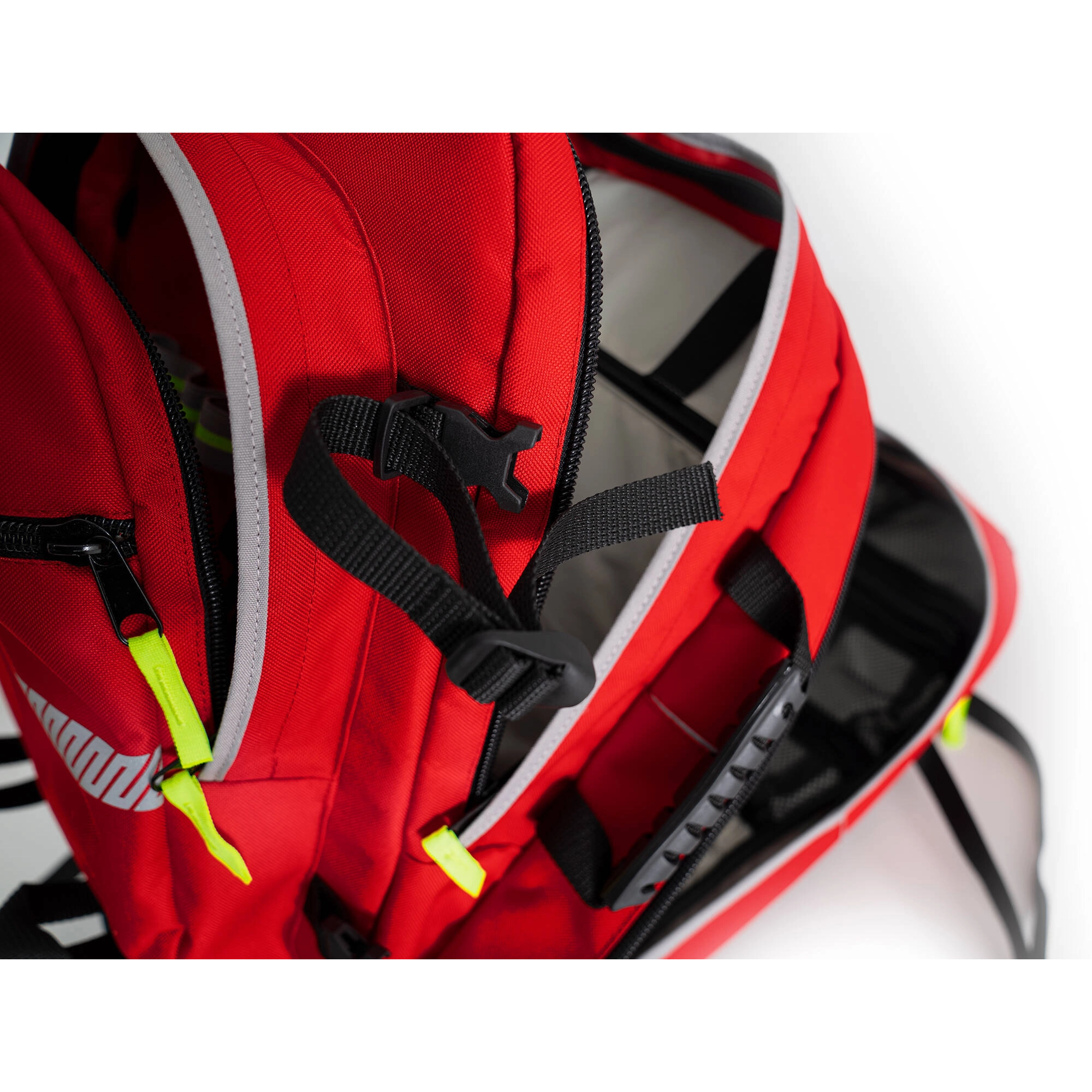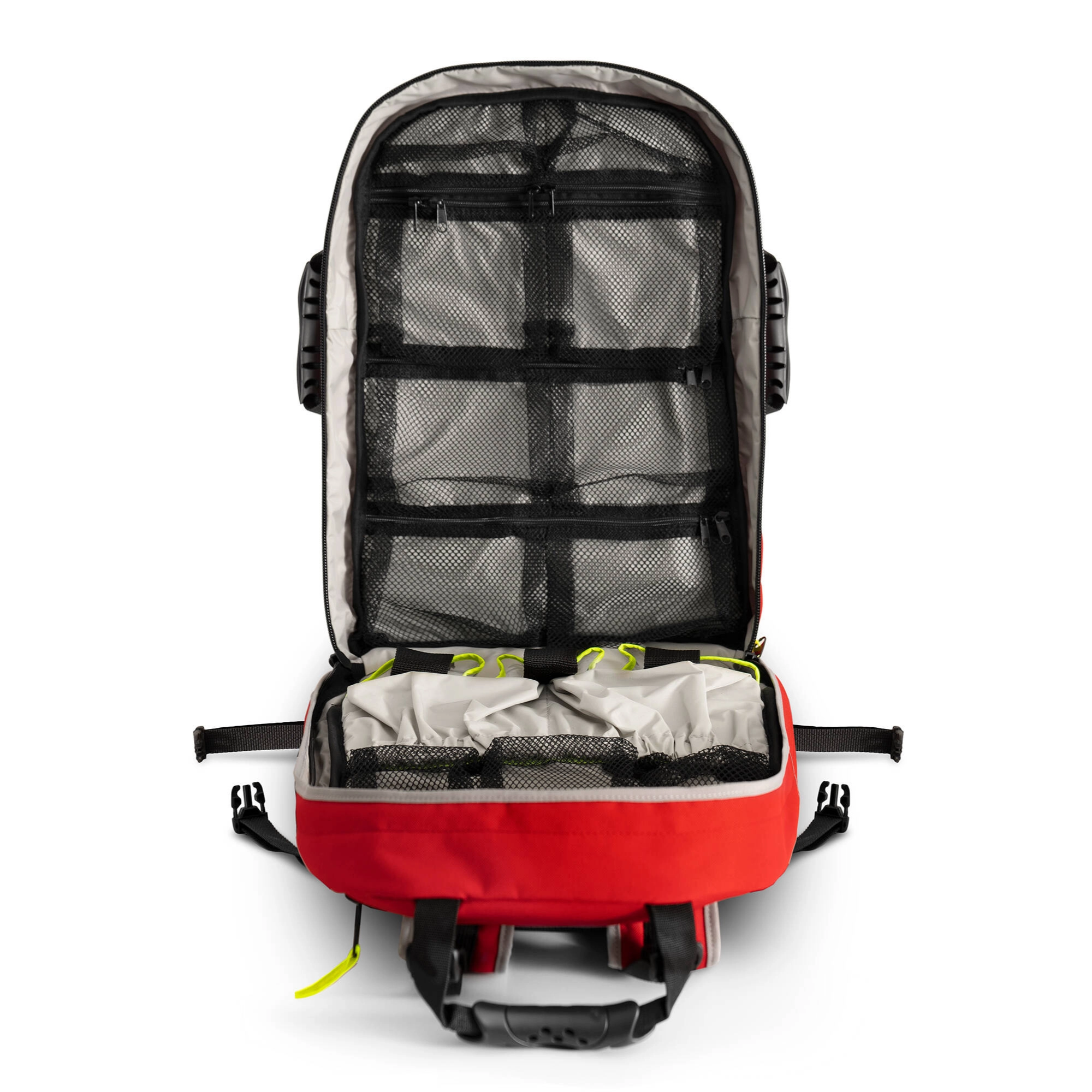 - Hlavná komora obsahuje sieťované vrecká na zips, látkové vrecká na suchý zips a pružné gumové úchyty na bezpečné a prehľadné uloženie zdravotníckeho materiálu.