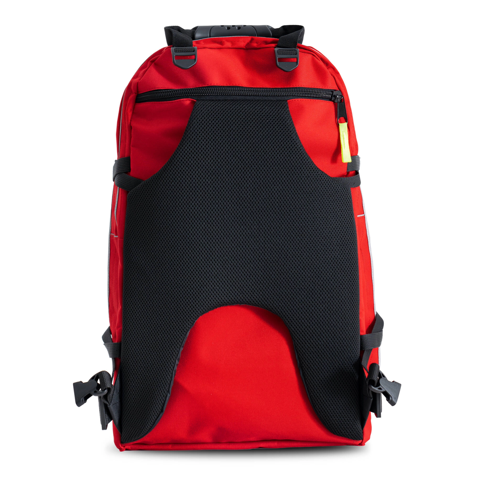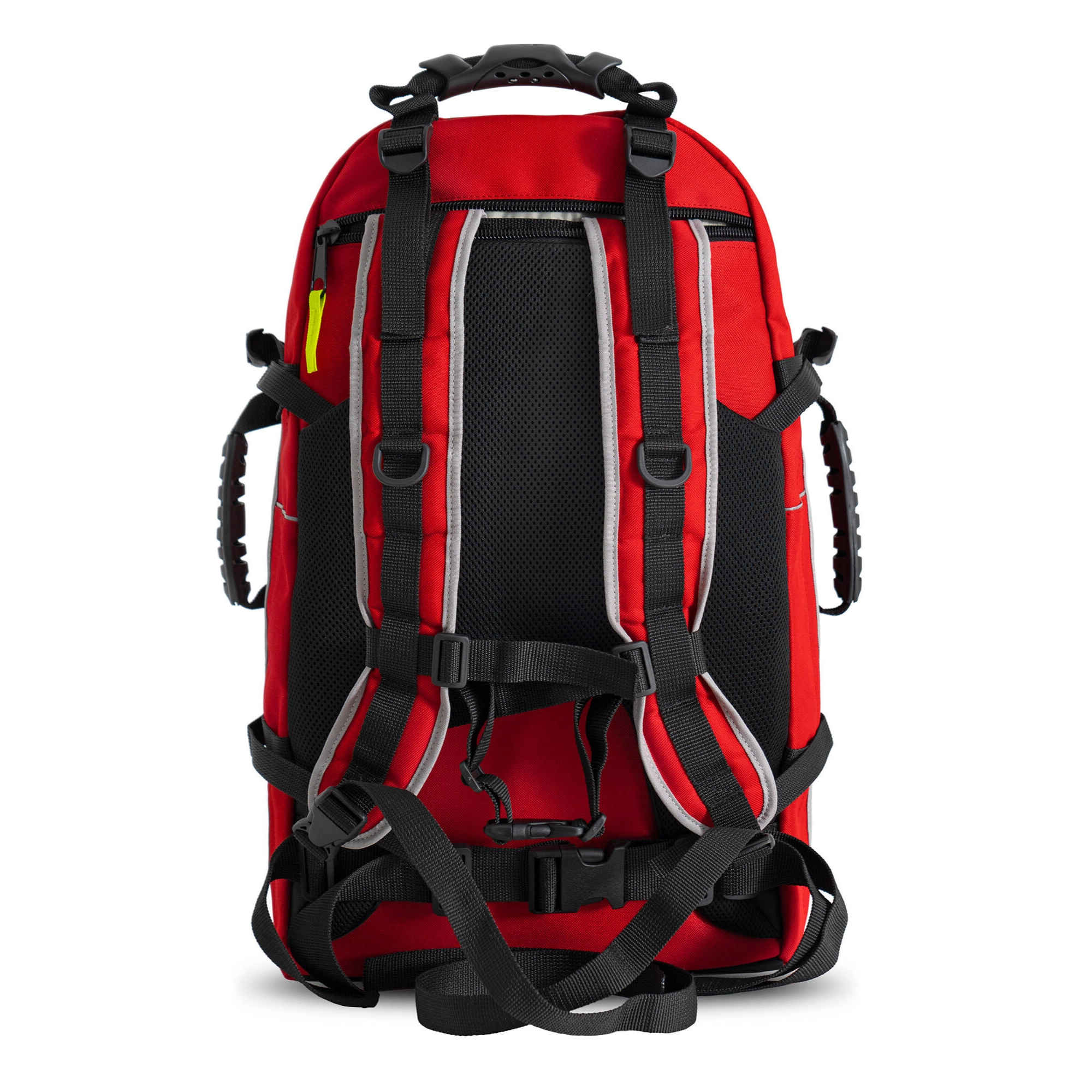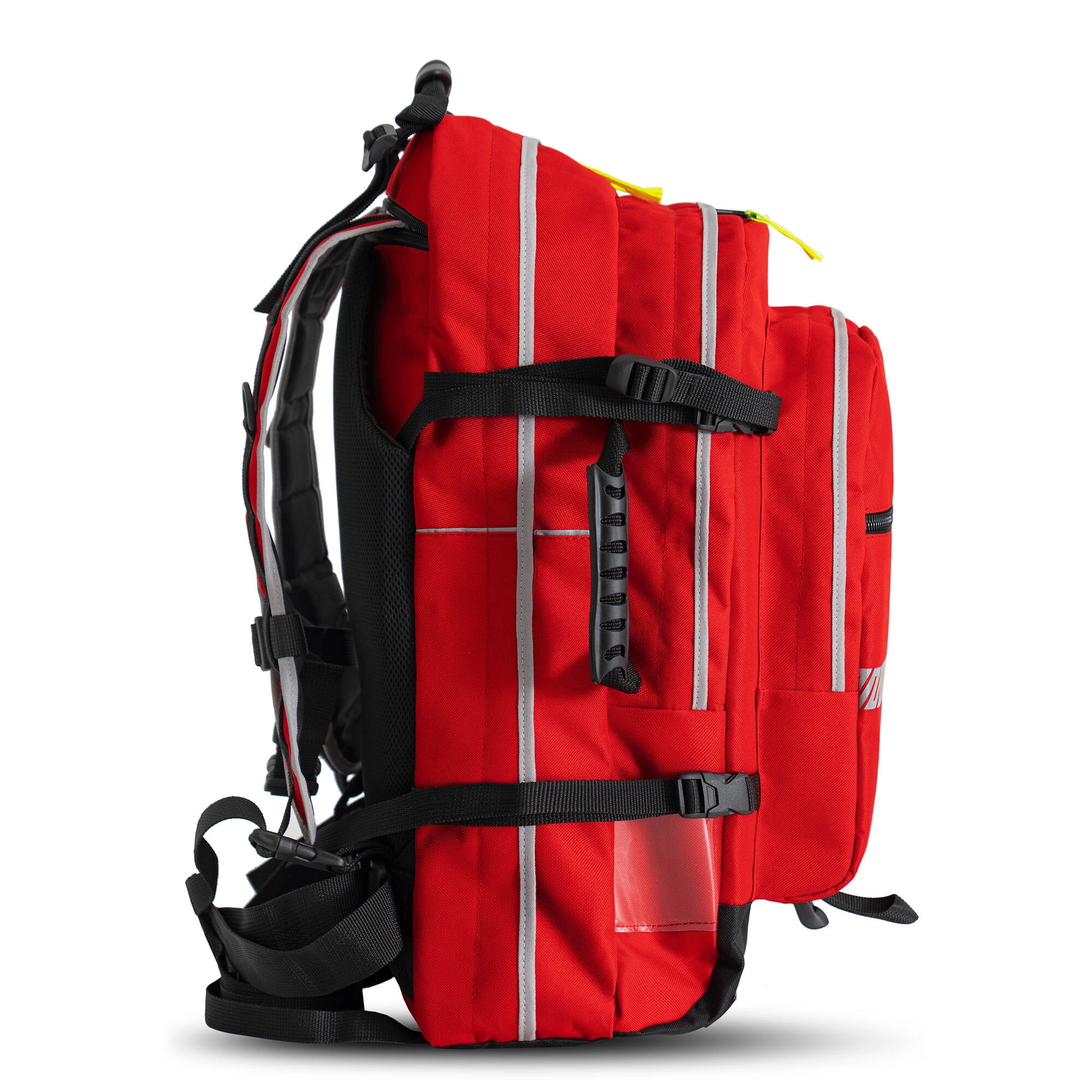 - Hlavná komora obsahuje sieťované vrecká na zips, látkové vrecká na suchý zips a pružné gumové úchyty na bezpečné a prehľadné uloženie zdravotníckeho materiálu.