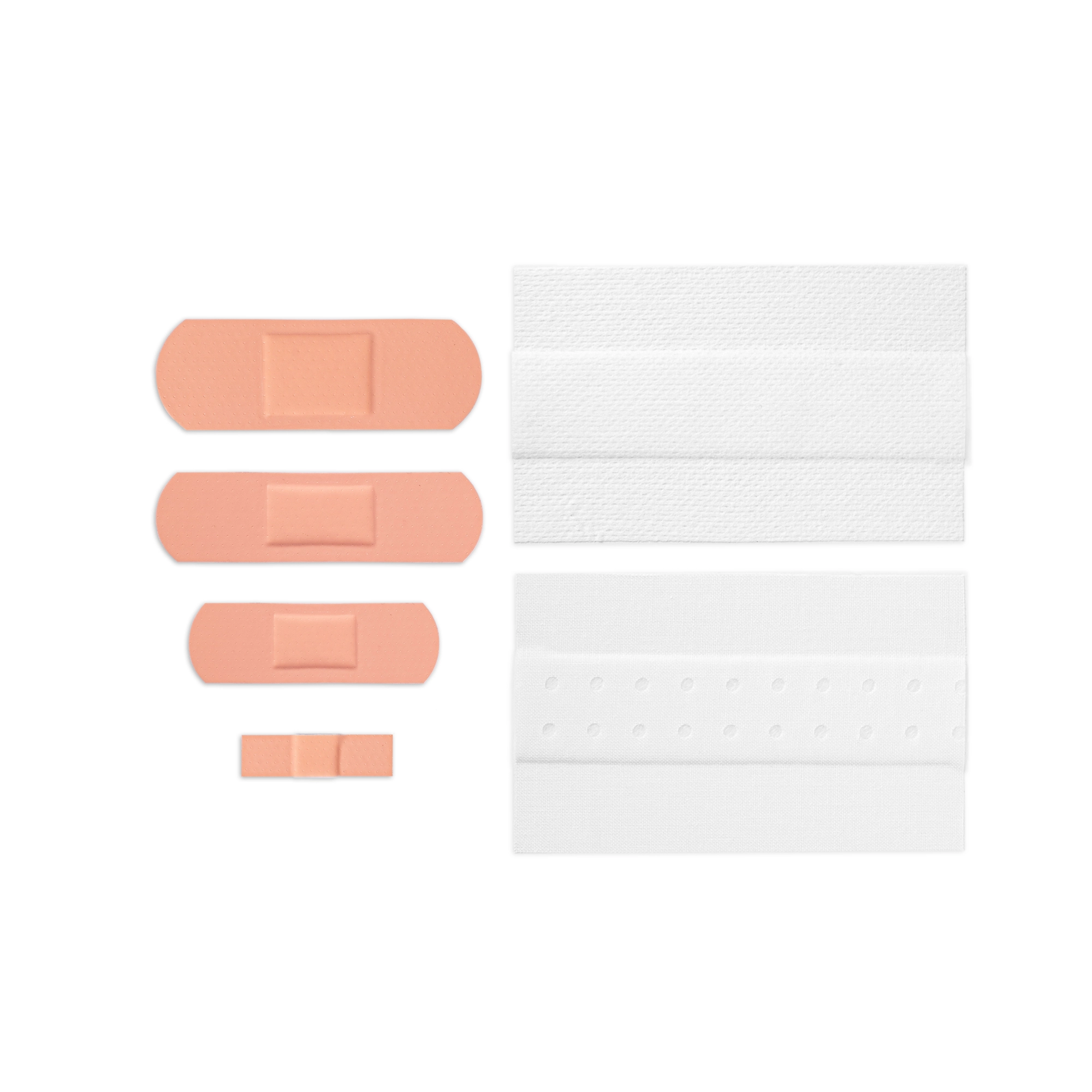 - Sada obsahuje náplasti z perforovanej PE fólie v telovej farbe, ako aj netkané a textilné náplasti na narezanie v bielej farbe.