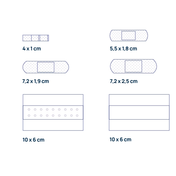 - Sada univerzálnych náplastí určených na ochranu malých rán, poranení kože, rezov, odrenín a tržných rán s malým až stredným množstvom exsudátu pred kontamináciou.