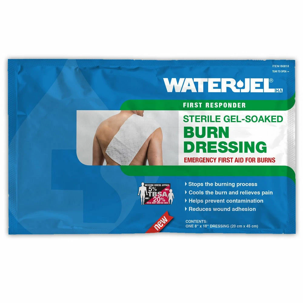 WATER-JEL® 20×45 cm sterilný obväz je prostriedok prvej pomoci pri termických popáleninách, to znamená, že je využiteľný všade tam, kde existuje reálne riziko popálenia, napr. priamym ohňom, horúcou tekutinou, parou, horiacim kovom, zásahom elektrického prúdu, prípadne výbuchom a pod. Zasahujúce jednotky požiarnej ochrany, vozidlá rýchlej záchrannej služby prvej pomoci, lekárničiek prvej pomoci na pracoviskách, ale aj v domácnosti a pod. Výrazným spôsobom skracuje čas pri poskytnutí pomoci a tým zabraňuje rozšíreniu a prehĺbeniu popáleninového zranenia.
